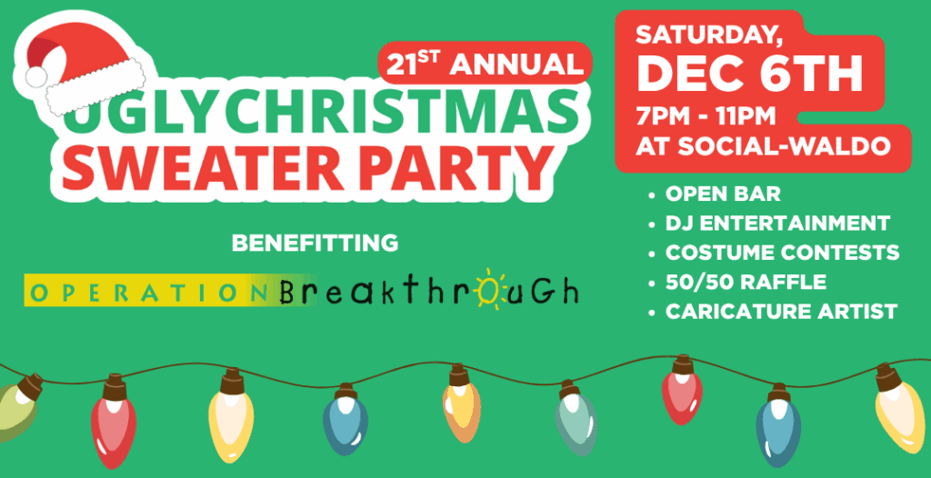 The Ugly Christmas Sweater Party is an annual open bar holiday party, thrown by a group of volunteers, that supports Operation Breakthrough by raising funds and awareness for kids living in poverty in Kansas City’s urban core. Save the date for the 21st Annual Ugly Christmas Sweater Party at Social-Waldo on Saturday, December 6, 2025!